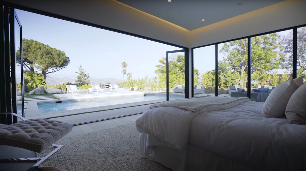 Hollywood Regency is a two-story home with modern design and architecture. It is floor-to-ceiling windows, iron spiral staircases, the angular residence is full of unique touches, and Fleetwood sliding pocket doors.